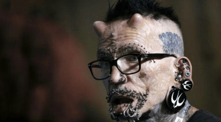 Ametoboa vitobo vingi sana kuzunguka mdomo wake, katika pua na pajilake la uso ambayo huvimia kuweka vipuri. Anatattoo nyingi sana katika mwili wake na pia amepandikiza nyama upande wa kulia na wakushoto wa paji lake la uso zinazomfanya aonekane kama ni mtu mwenye mapembe.