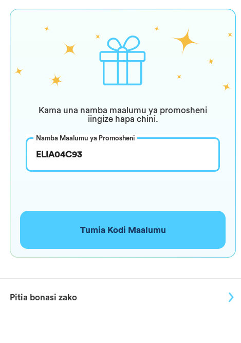 Kama unahitaji kupata zawadi hiyo basi ingize app kwenye simu yako Kisha jisajili. Ukijisajili Gusa sehemu ilioandikwa “Alika” alafu chagua “Ingiza Nambari ya promosheni” kama unavyoona hapa chini.